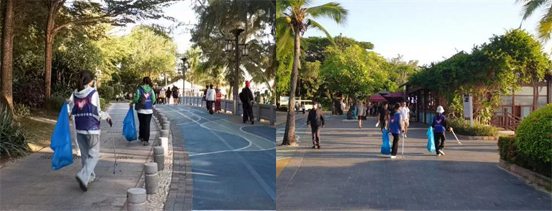 在净滩环保的志愿活动中,志愿者们手持垃圾袋和垃圾夹在天涯海角景区内拾取游客们丢弃的垃圾。该志愿活动不仅维护了海滩的卫生,美化了景区的环境,并且以身作则提高了游客们的环保意识。游客们在志愿者的感染之下纷纷自觉摒弃随地乱扔垃圾的陋习,自觉维护景区优美的自然环境。